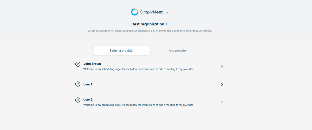 <li>There is an organization scheduling page with a list of all members in the organization (see an example [https://harmonizely.com/o/south-park-2 https://harmonizely.com/o/south-park-2])</li>