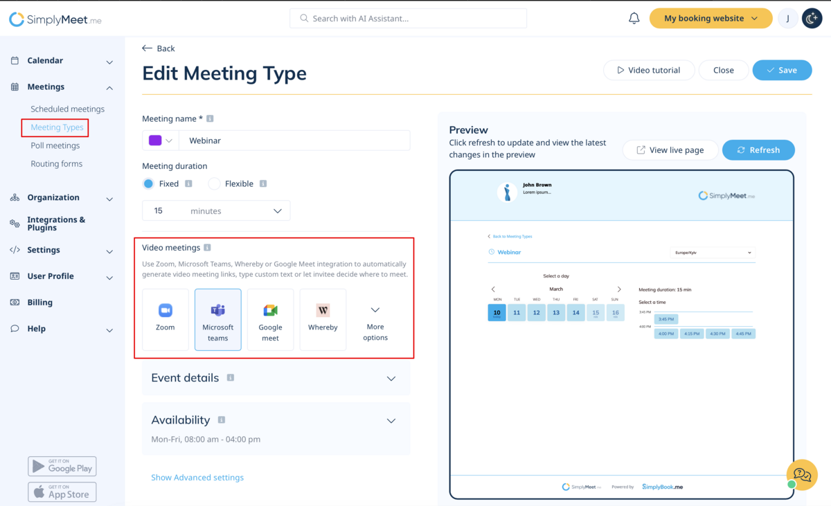 2. In your [https://secure.simplymeet.me/event_types/#/ Meeting Type] settings choose the '''Microsoft Teams''' meeting option from the '''Video meetings''' section. | |||