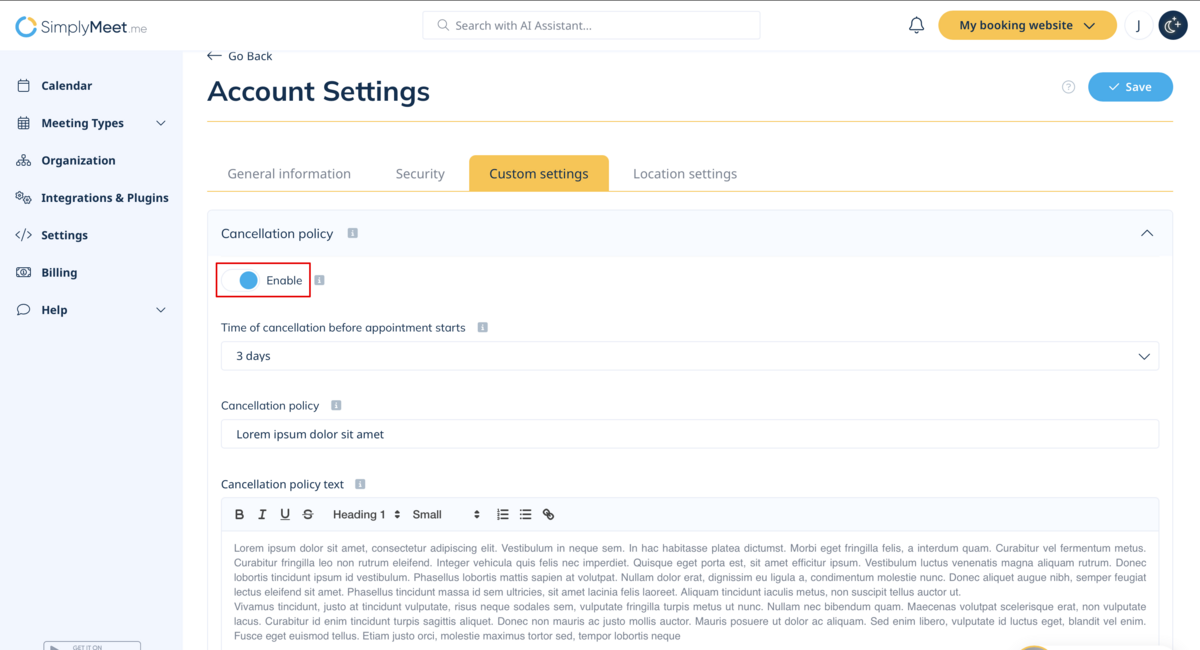- 3. Insert the text for the label and the cancellation policy text to the corresponding fields, set the timeframe for the meetings cancellations.