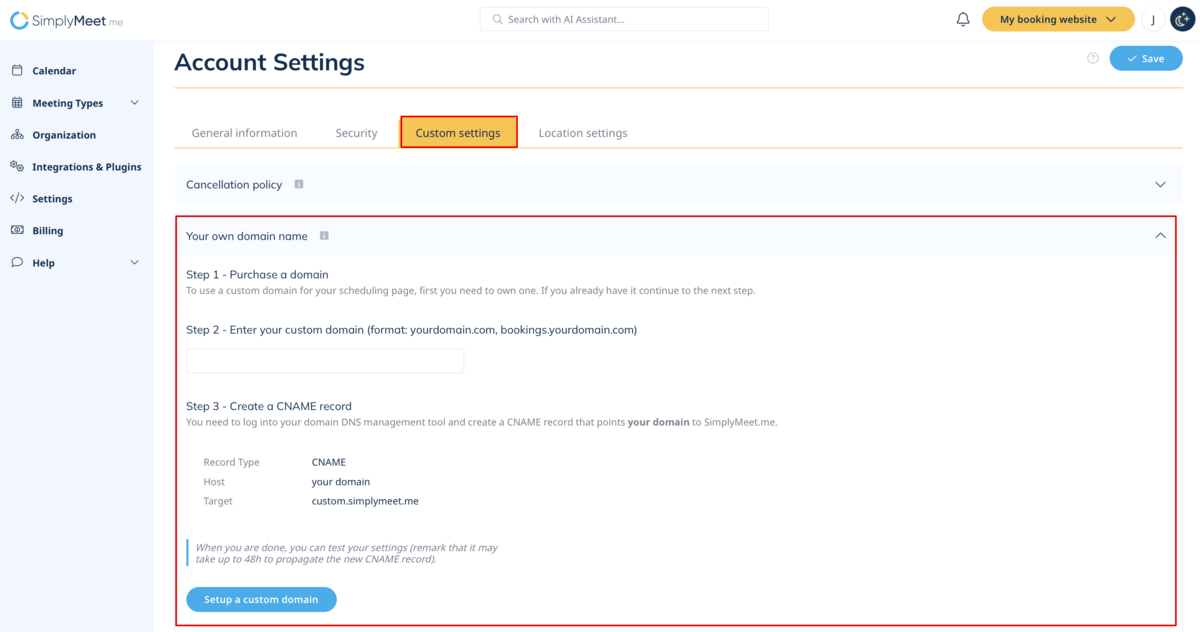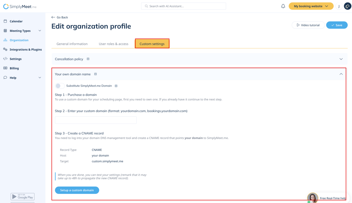 If you are setting custom domain on the ''organization level'' - please navigate to '''[https://secure.simplymeet.me/organization/settings Organization settings]''' page -> Custom settings -> Your own domain name | If you are setting custom domain on the ''organization level'' - please navigate to Settings -> '''[https://secure.simplymeet.me/organization/settings Organization settings]''' page -> Custom settings -> Your own domain name | ||