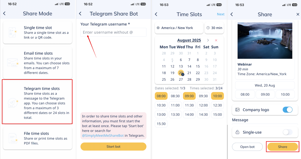 • Before sharing, make sure you've started the SimplyMeet.me Telegram bot at least once. You can do this by clicking the Open Bot button in the sharing interface(or in app settings) or searching for the bot @Simply_Meet_Me_Share_Bot in Telegram