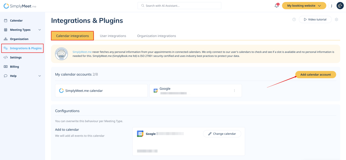 First things first, let’s get your online calendar connected to SimplyMeet.me so the booked meetings can be added there and so you're never double booked.