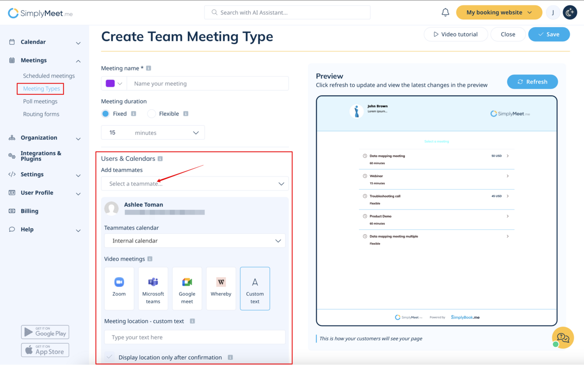 Note: To be able to create Round Robin Meeting Types and assign teammates you must be an owner of the organization. You must have at least two SimplyMeet.me paid licenses to be able to create an organization.