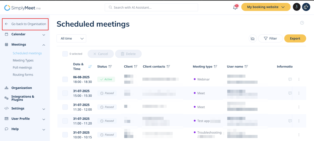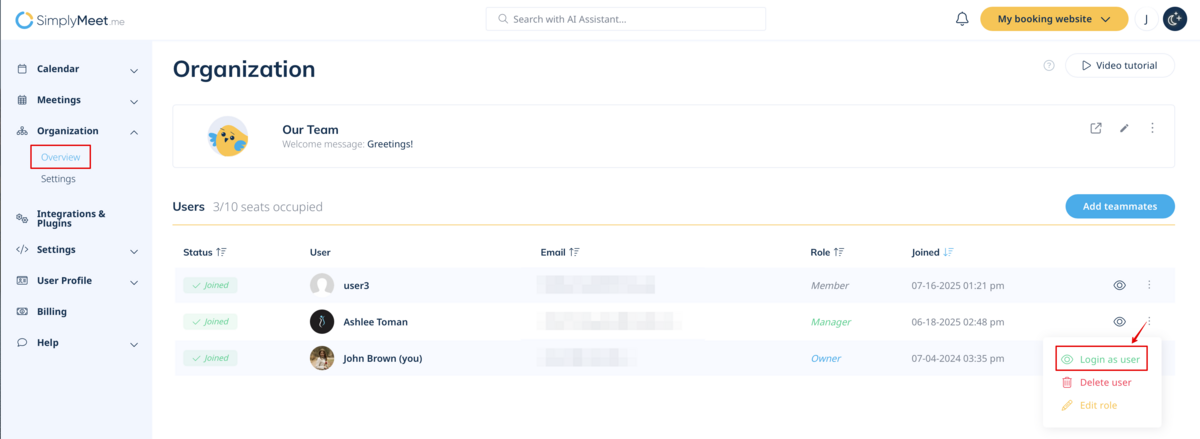 The Log in as User feature allows Organization Owners to securely access individual user accounts within their SimplyMeet.me organization only after the user has given consent.