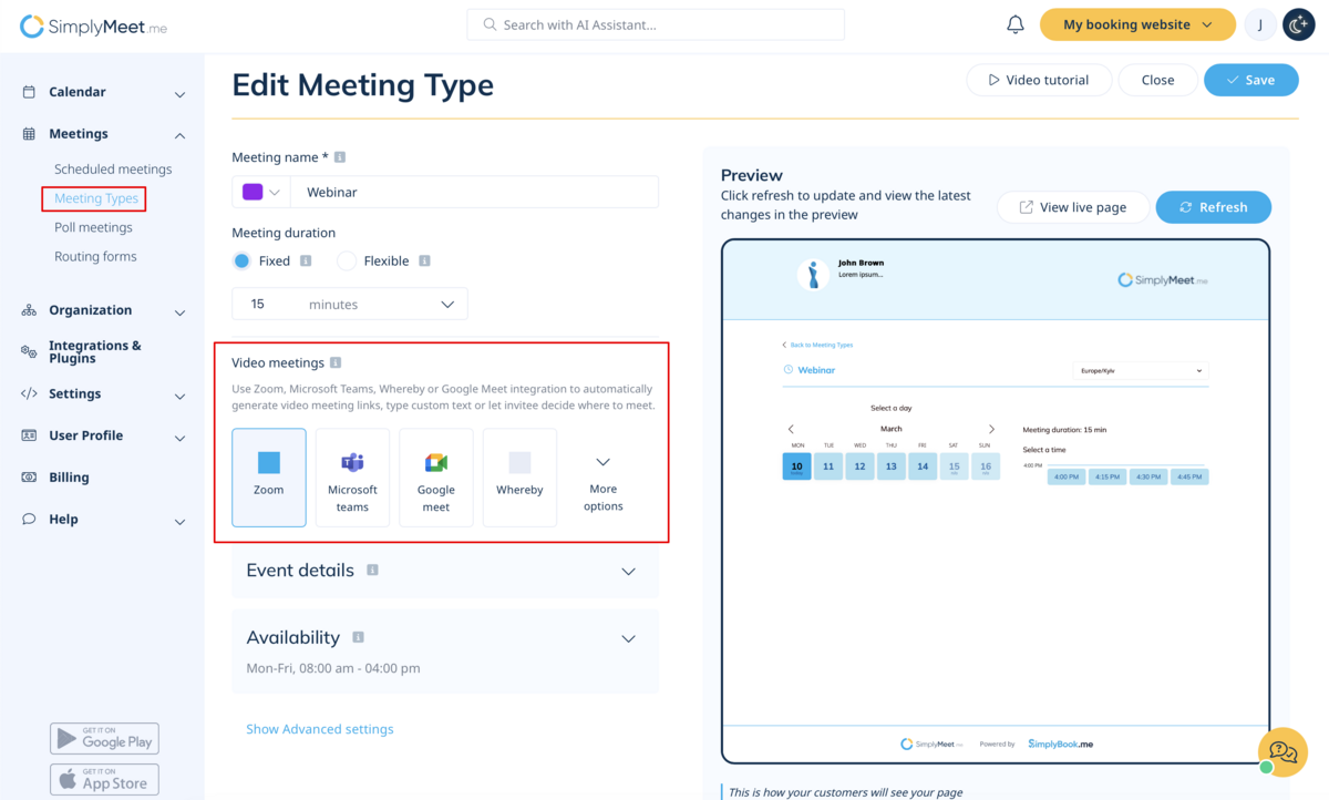 The SimplyMeet.me Zoom integration automates your clients' booking by generating a unique video conference link for every meeting.